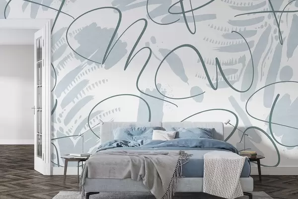 Fotobehang Kalligrafische abstractie met letters, penseelstreken, blauwe kleur N° w03913v1