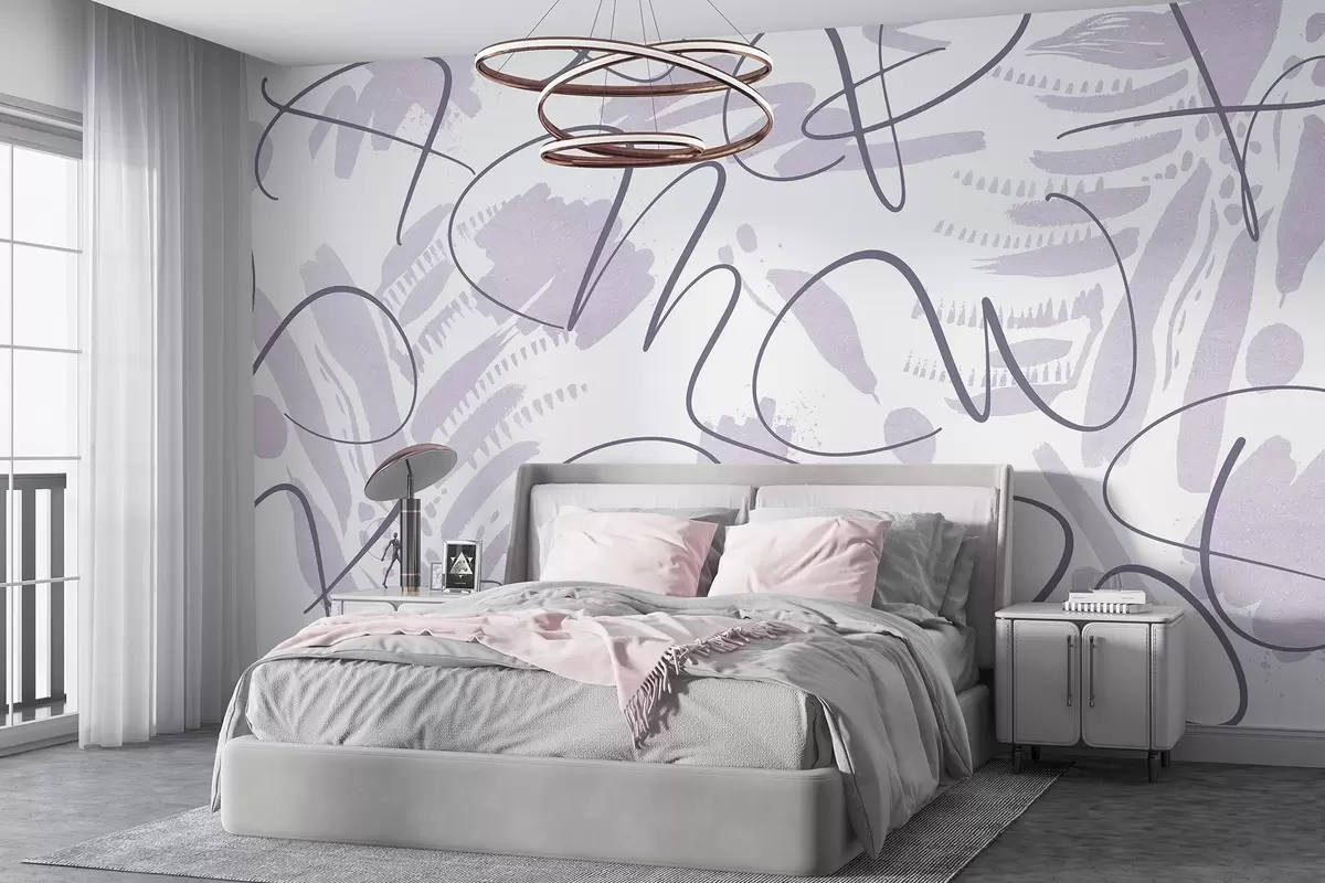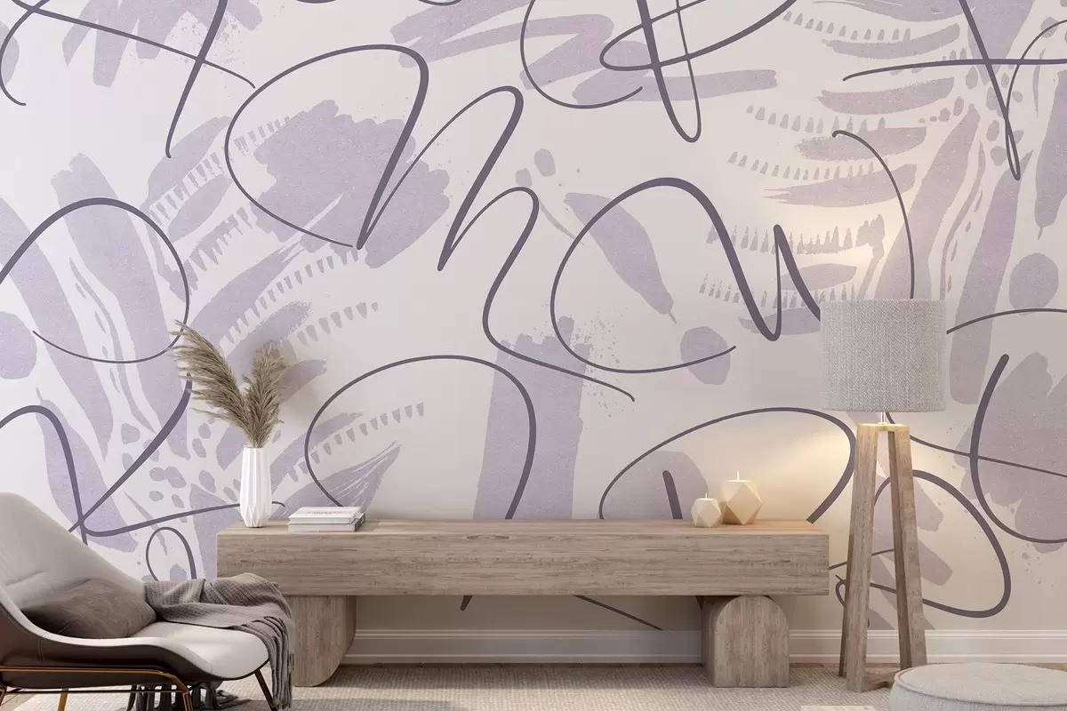 Fotobehang Kalligrafische abstractie met letters, penseelstreken, paarse kleur N° w03913v2