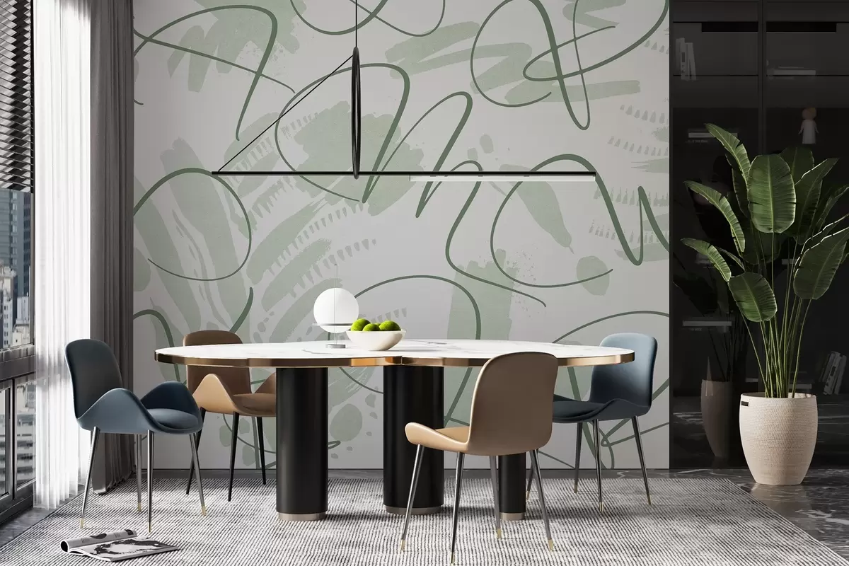Fotobehang Kalligrafische abstractie met letters, penseelstreken, groene kleur N° w03913v3