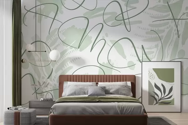 Fotobehang Kalligrafische abstractie met letters, penseelstreken, groene kleur N° w03913v3