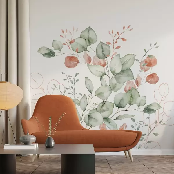 Fotobehang Vegetatie en takken imitatie van getextureerde aquarel, tinten groen en rood N° w03927v1