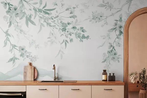 Fotobehang Bloeiende takken, imitatie van aquarel, groene tinten N° w03935v3