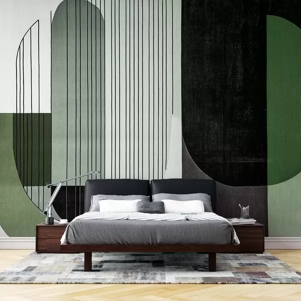 Fotobehang moderne abstracte geometrische compositie met overlappende vormen en verticale lijnpatronen, dunne lijnen die trapeziums en ovalen vullen, overlay van zachte textieltextuur, warme gedempte tinten zoals olijfgroen, taupe, beige en houtskool, subtiele transparantie-effecten tussen vormen N° w03937v3