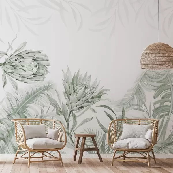 Fotobehang Protea tussen tropische bladeren, blauwe tinten N° w03952v3