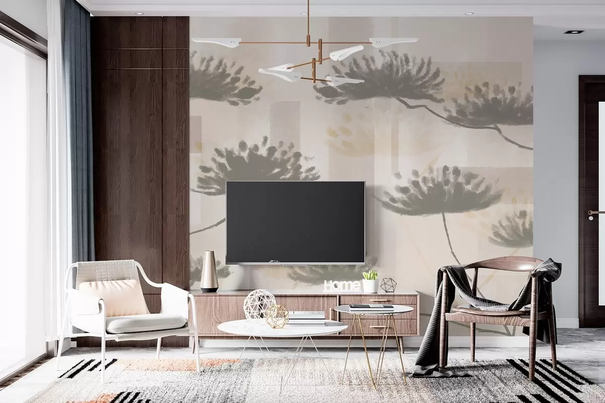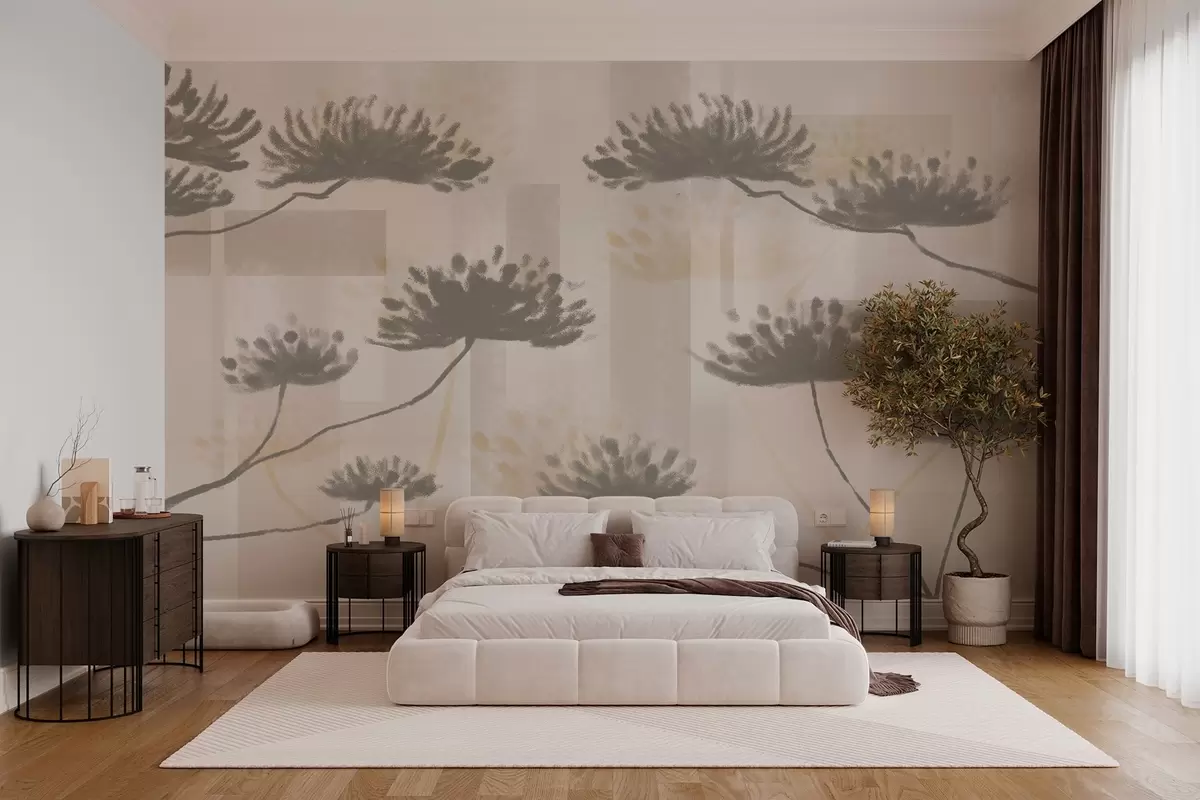 Fotobehang geometrische structuur in beige- en crèmetinten met gestileerde paraplubloemen N° w03960