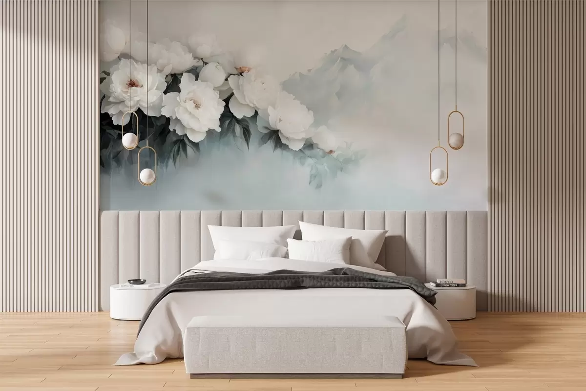 Fotobehang schilderachtige weelderige witte pioenrozen tegen de achtergrond van mistige bergen N° w03965