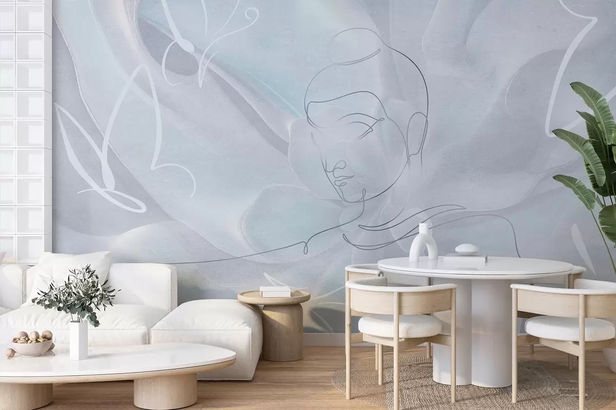 Fotobehang Bloemenabstractie met Boeddha lijntekening, blauwe kleuren N° w04004v1