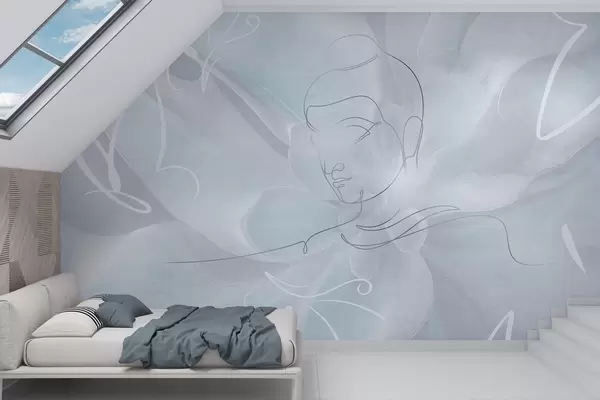 Fotobehang Bloemenabstractie met Boeddha lijntekening, blauwe kleuren N° w04004v1
