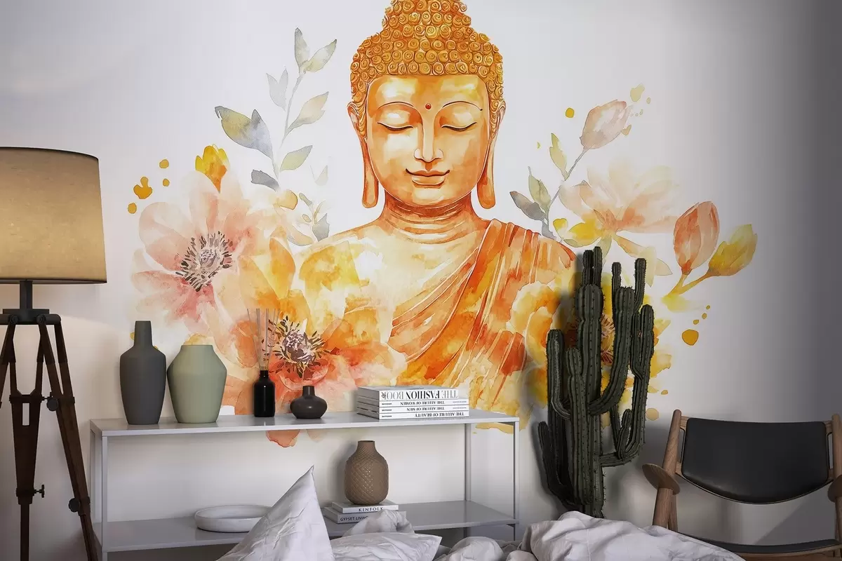 Fotobehang Aquarel Boeddha met bloemen, spiritueel, oranje kleurenpalet N° w04005