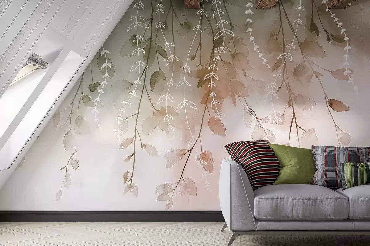 Fotobehang Takken met bladeren in aquarelstijl, natuurlijke herfstkleuren N° w04007v1