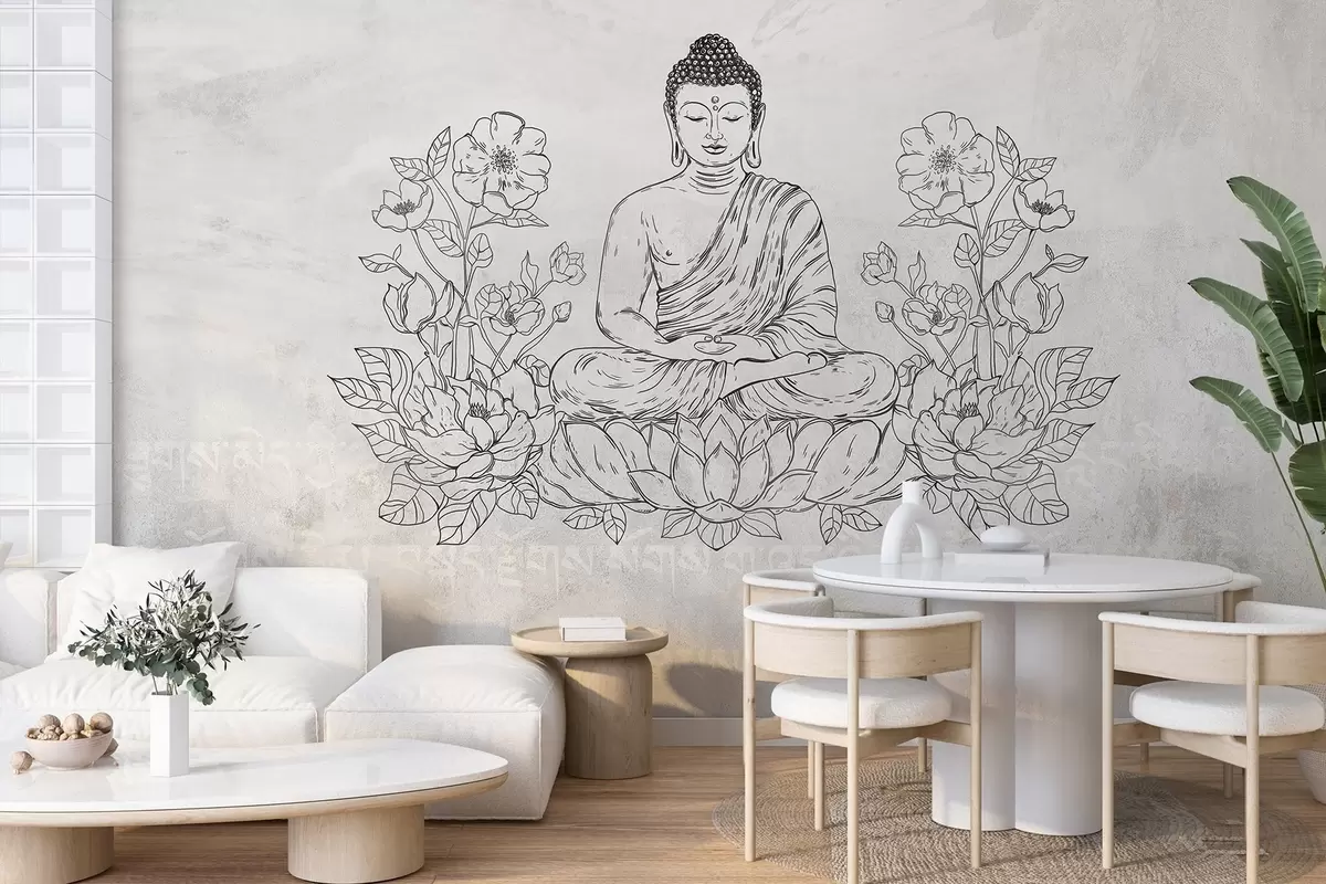 Fotobehang Mediterende Boeddha met lotusbloemen, lijntekening, oosters, beige achtergrond N° w04008v1