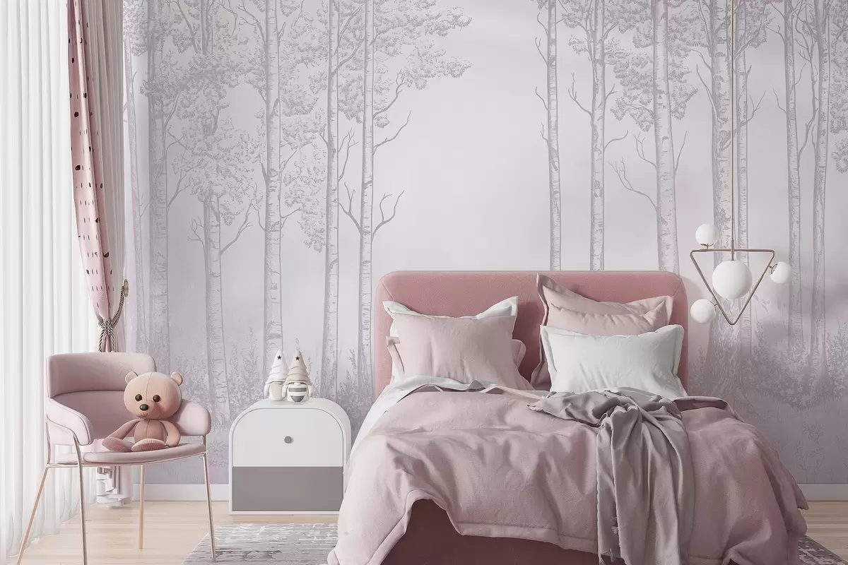 Fotobehang Bos met berken, minimalisme, natuur, roze kleurenpalet N° w04009v2