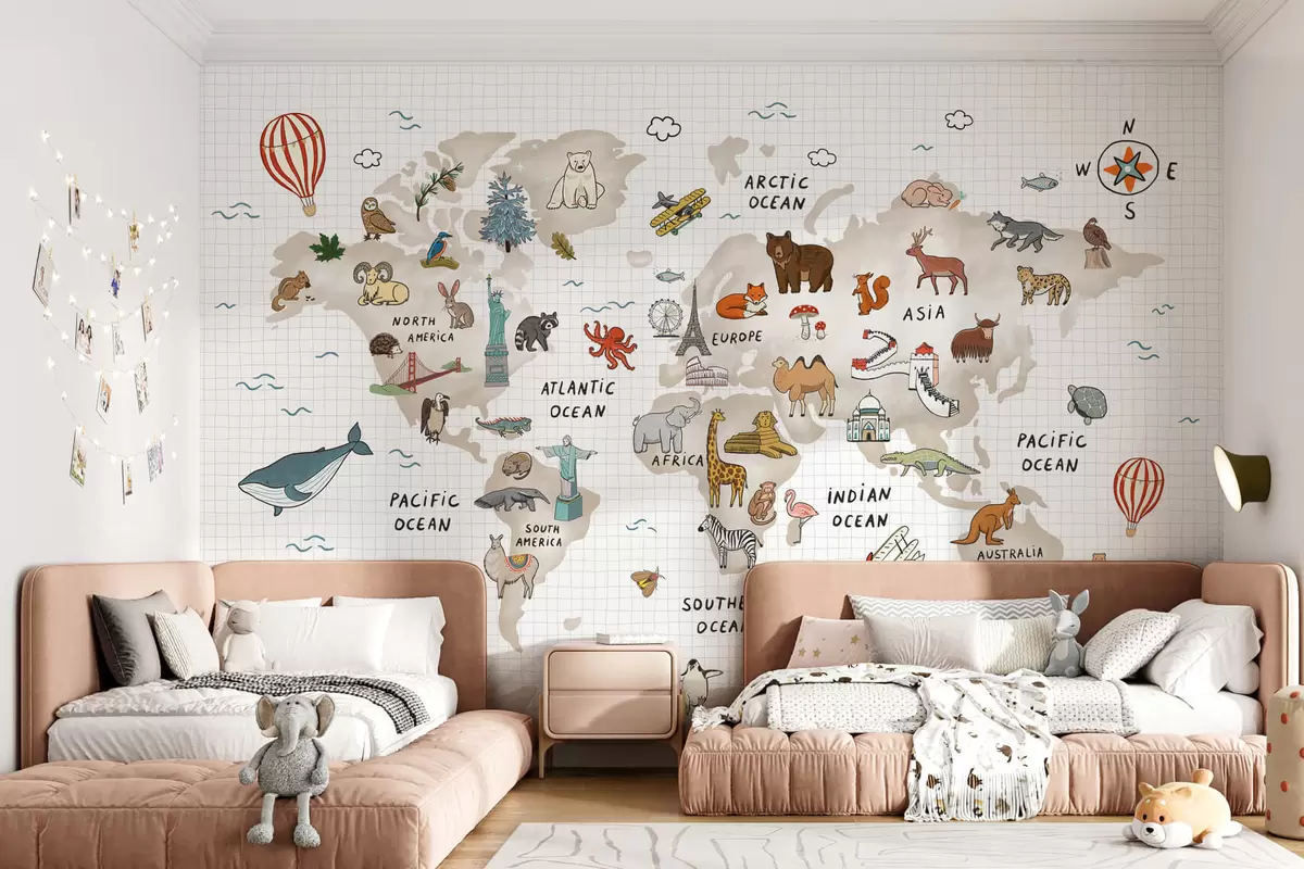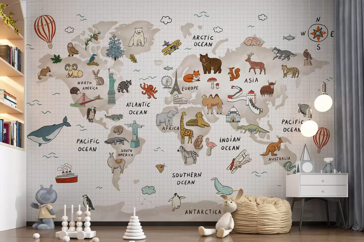 Fotobehang Wereldkaart met dieren en oriëntatiepunten N° w04011