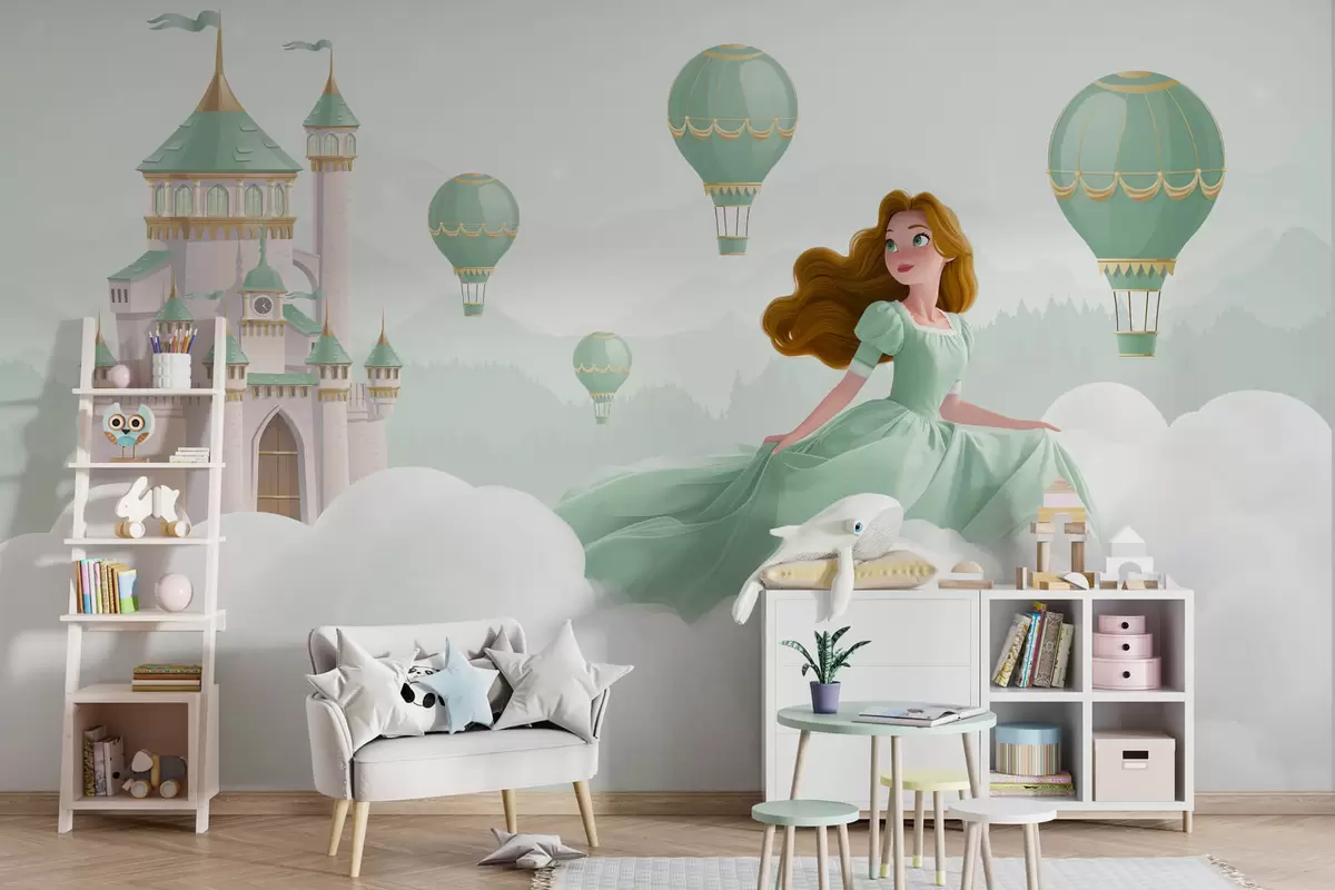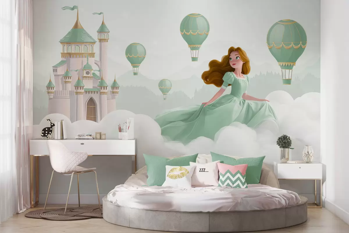 Fotobehang Prinses tussen de wolken op de achtergrond van het landschap met het kasteel N° w04015v2