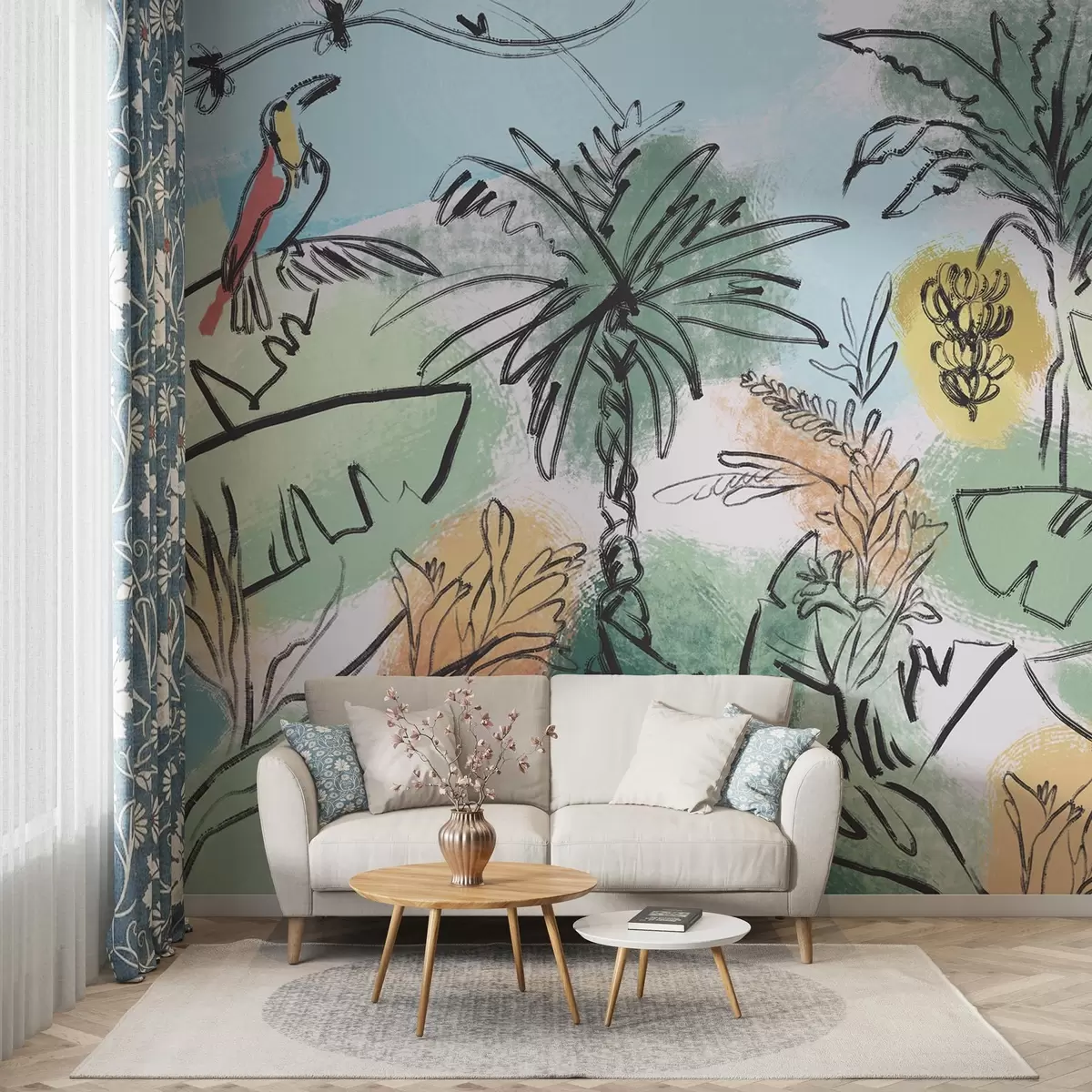 Fotobehang Tropische print met papegaaien, rijke kleuren, tropen N° w04019
