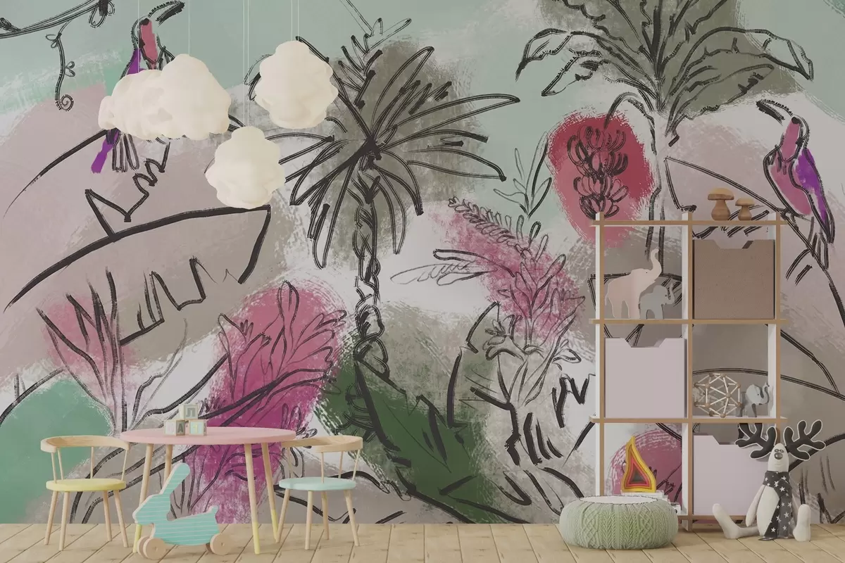 Fotobehang Tropische print met roze bloemen, exotische papegaaien N° w04019v1