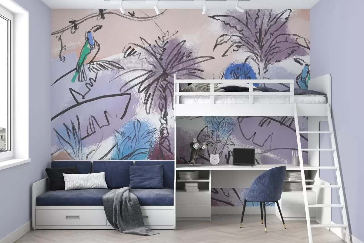 Fotobehang Tropische print met blauwe bloemen, schilderachtige papegaaien N° w04019v2