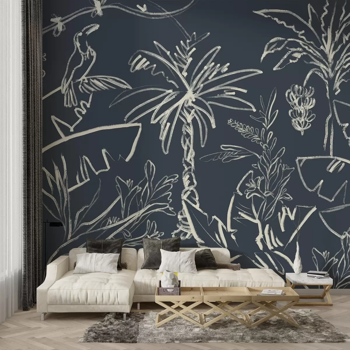 Fotobehang Tropisch patroon op donkerblauwe achtergrond, palmbomen, bananen N° w04020v4