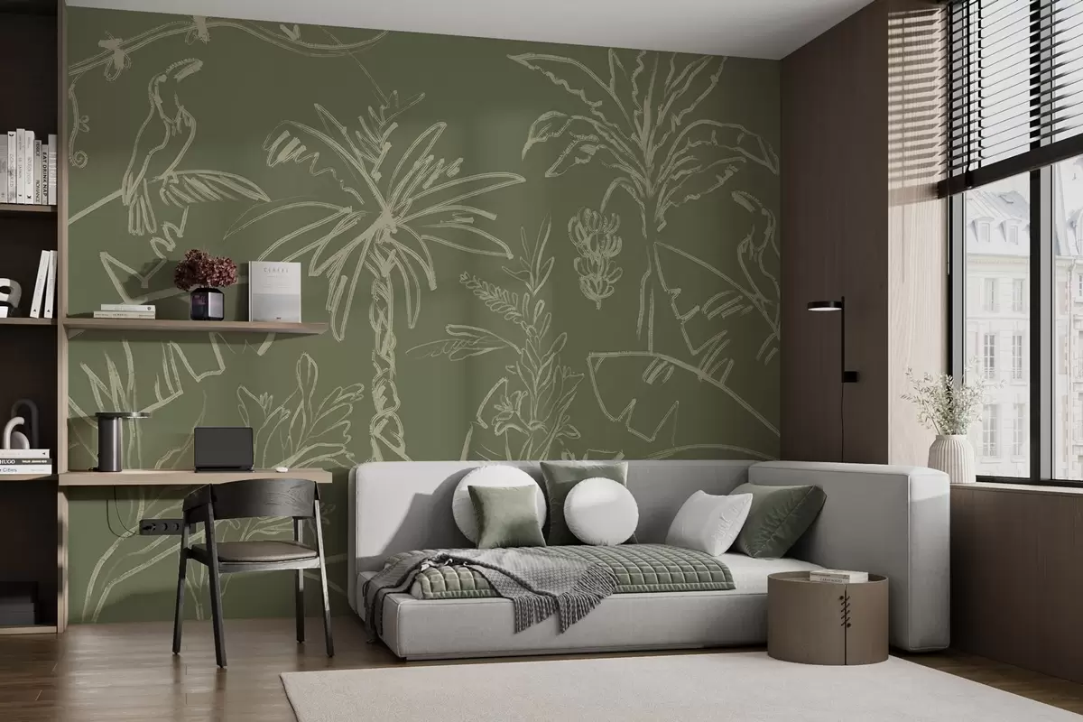 Fotobehang Tropisch patroon op groene achtergrond, palmbomen, bananen N° w04020v6
