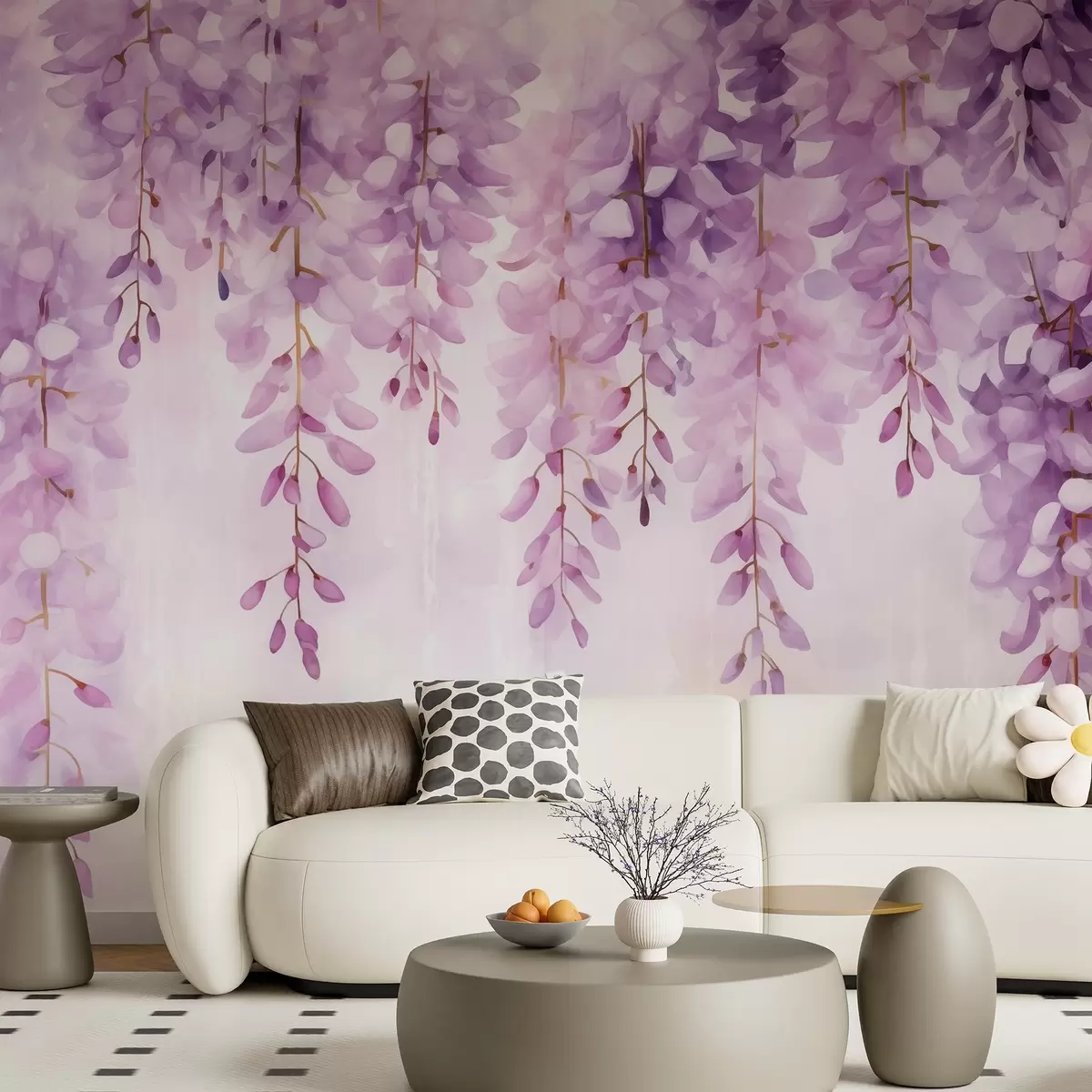 Fotobehang Delicate aquarelcompositie met watervallen van blauwe regen in zachte lavendel- en roze tinten die een vredige sfeer creëren, N° w04034