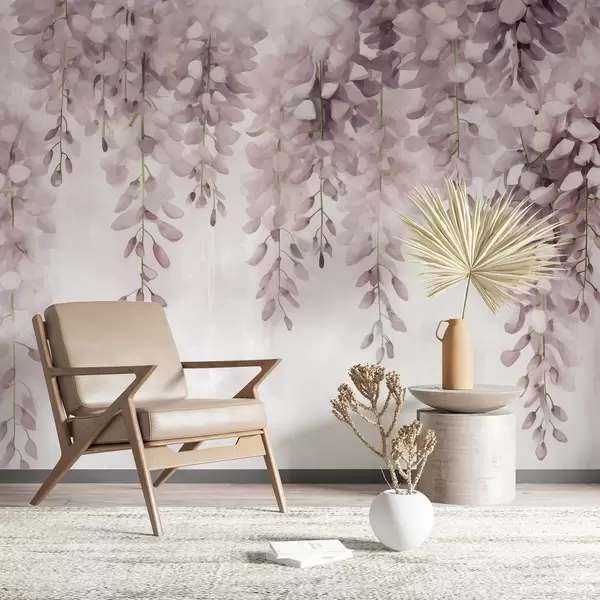 Fotobehang Zachte aquarelafbeelding in crèmekleurige roze tinten, met watervallen van blauwe regen die een dromerig bloemengordijn vormen N° w04034v2