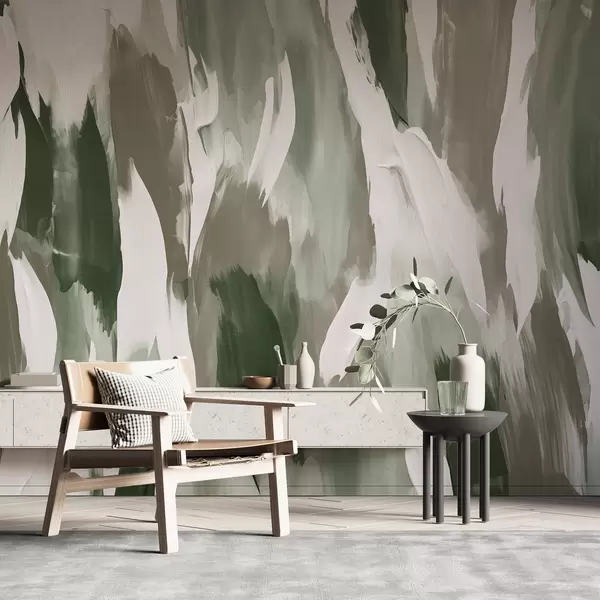 Fotobehang Abstracte penseelstreekcompositie in aardachtig groen, taupe en ivoor, die een geaard, op de natuur geïnspireerd ritme oproept N° w04035v1