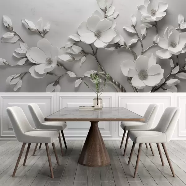 Fotobehang Dimensionale bloesemtak in zuiver wit en neutrale tinten N° w04039v2