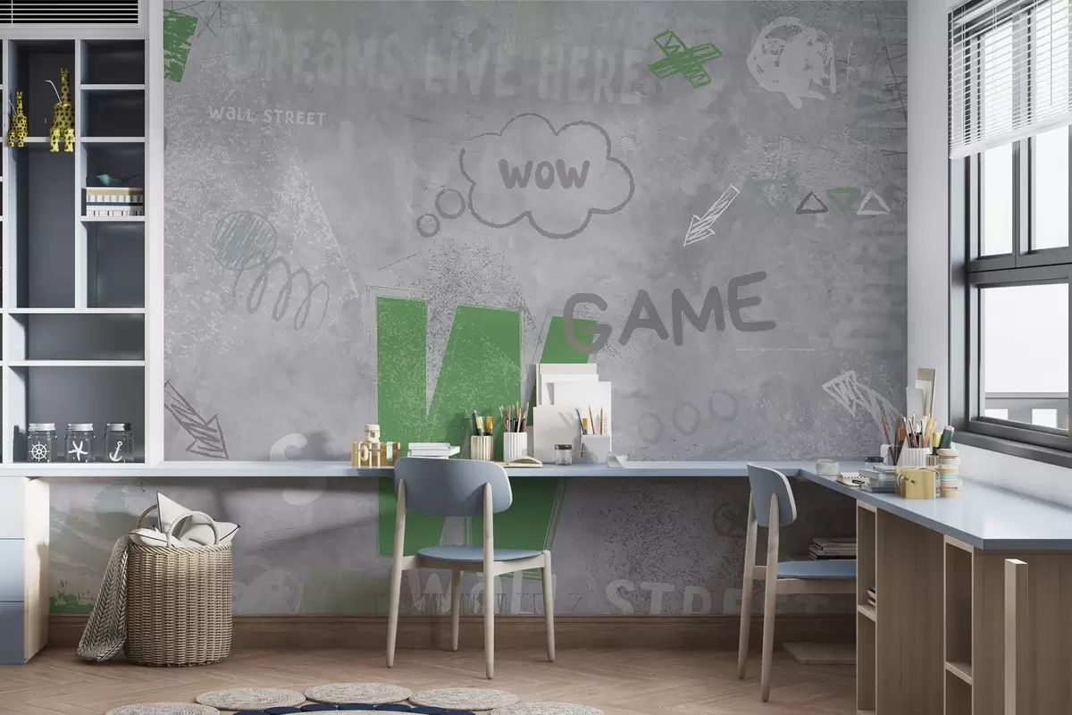 Fotobehang Street art ontwerp met groene letters op de achtergrond van betonnen muur N° w04056v2