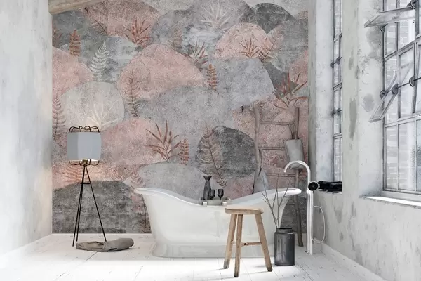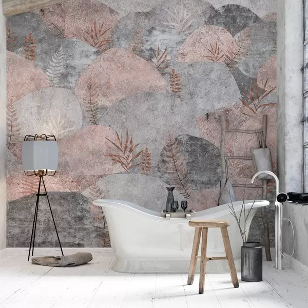 Fotobehang Stenen met planten, varen, nordic, rustieke stijl, grijze en roze kleuren N° w04064v1