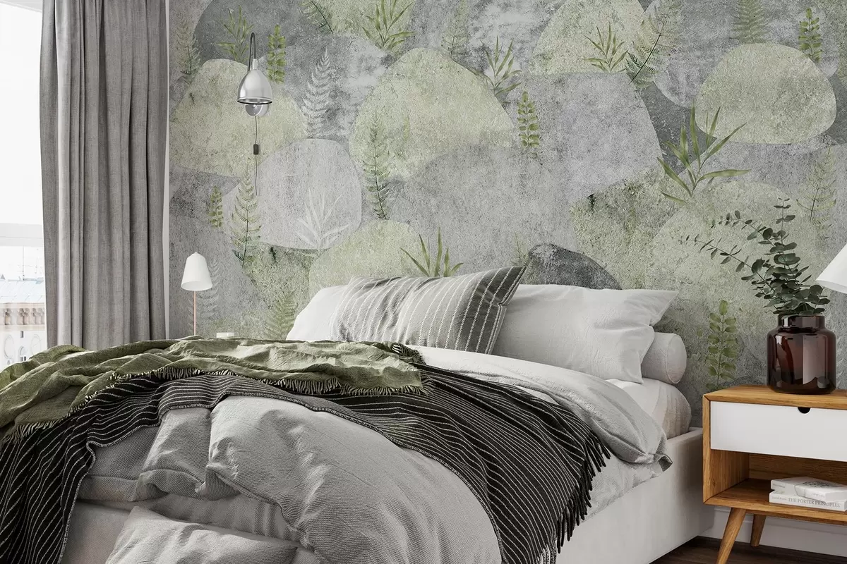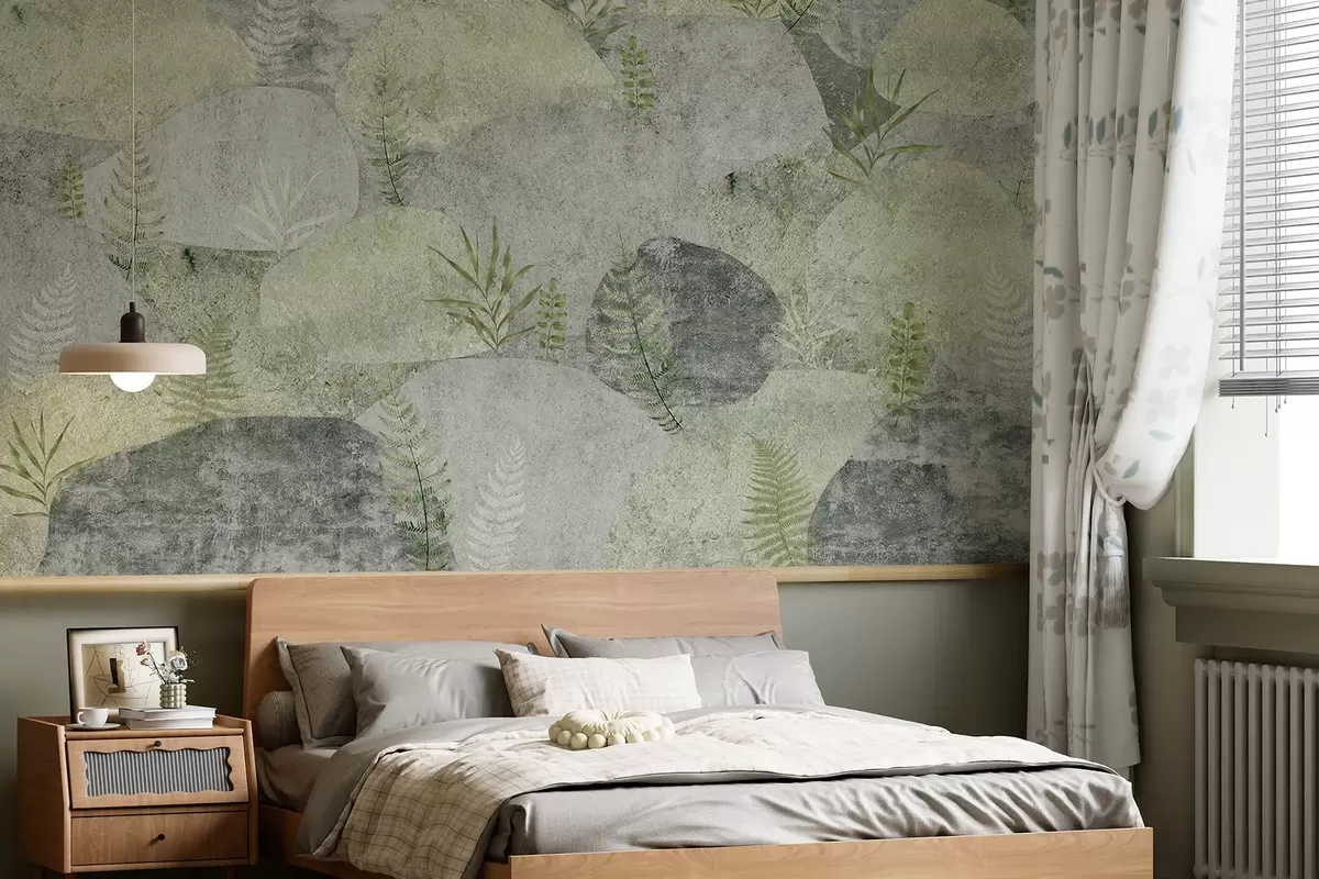 Fotobehang Stenen met planten, varen, nordic, rustieke stijl, grijze en groene kleuren N° w04064v2