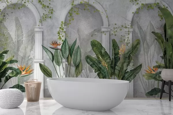 Fotobehang Betonnen muur met bogen en tropische planten, bloemen, natuurlijke kleuren N° w04065