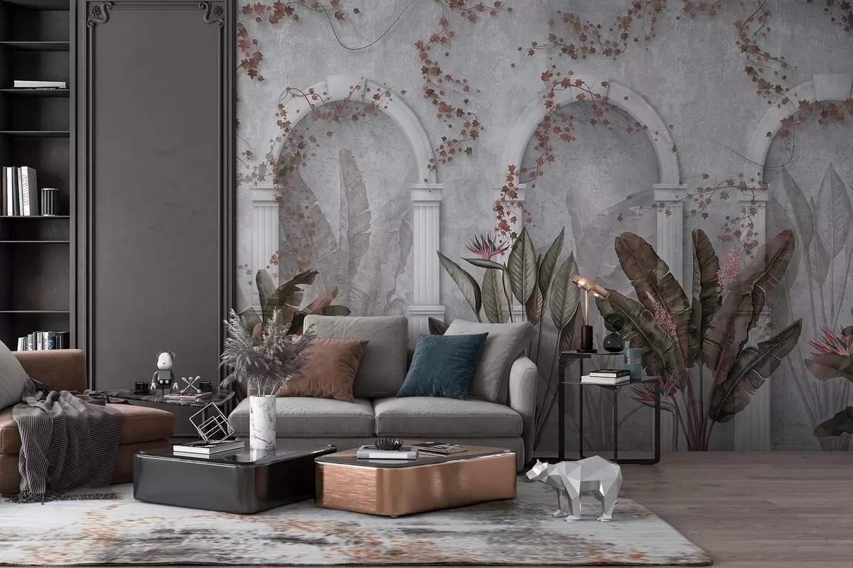 Fotobehang Betonnen muur met bogen en tropische planten, bloemen, bordeauxrode kleuren N° w04065v1