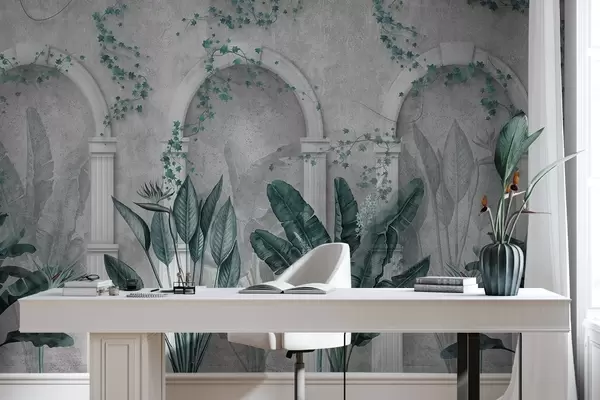 Fotobehang Betonnen muur met bogen en tropische planten, bloemen, blauwe kleuren N° w04065v2