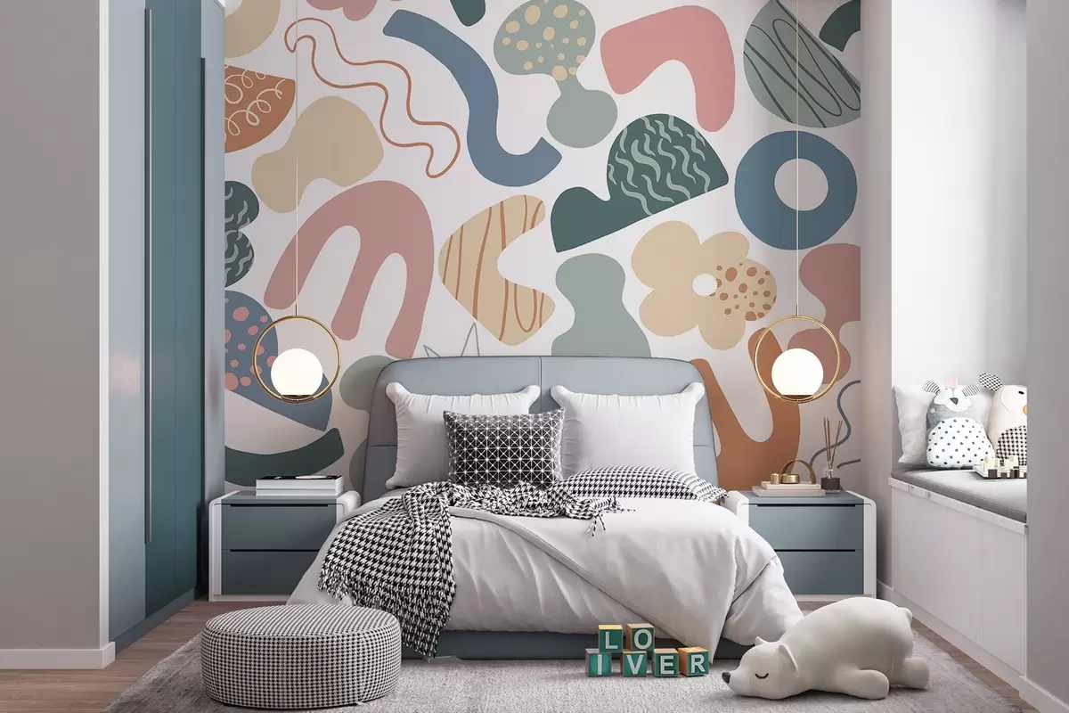 Fotobehang Geometrische cijfers met krabbels tekening, jong, groen, roze, blauw N° w04068v2