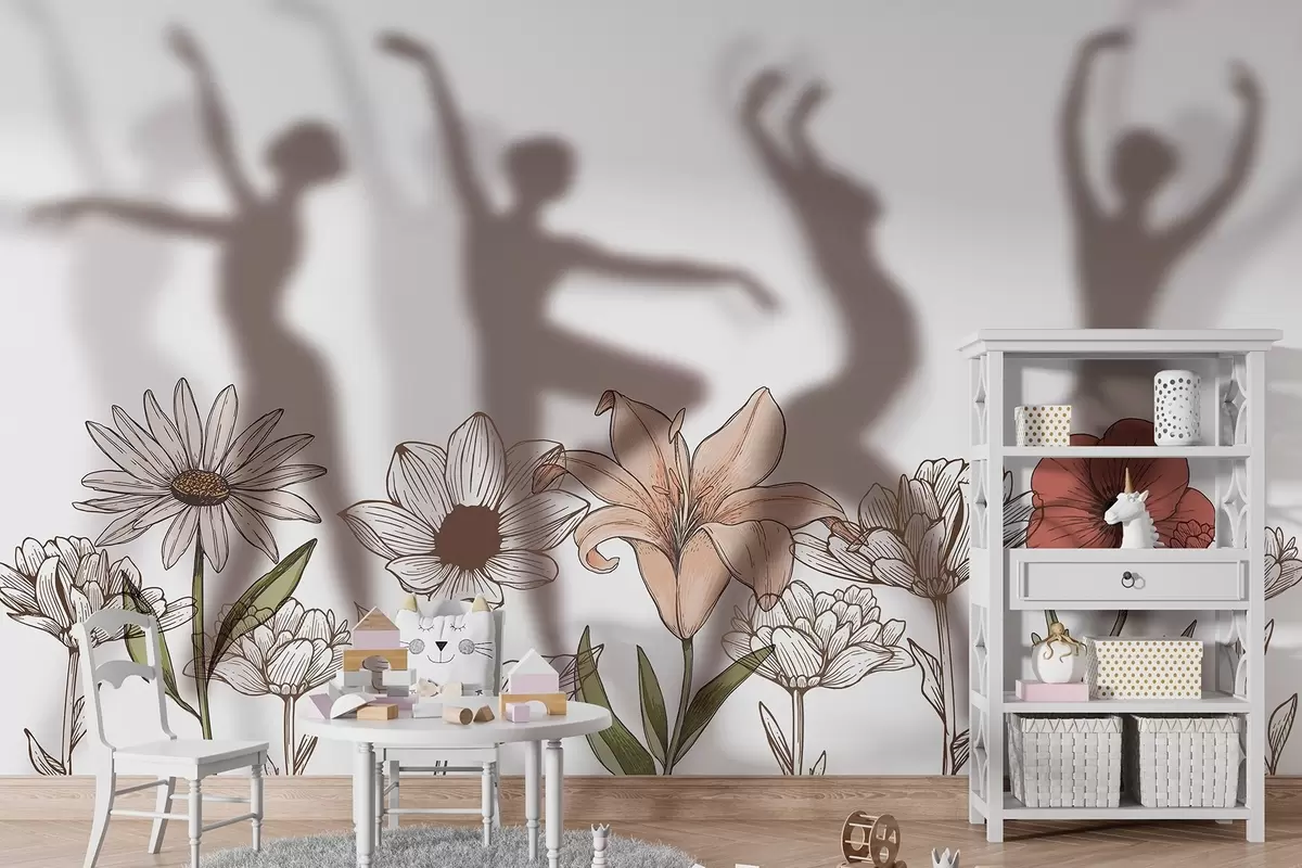Fotobehang Silhouetten van ballerina's, rustieke bloemen, lijntekeningen, rode en beige kleuren N° w04069