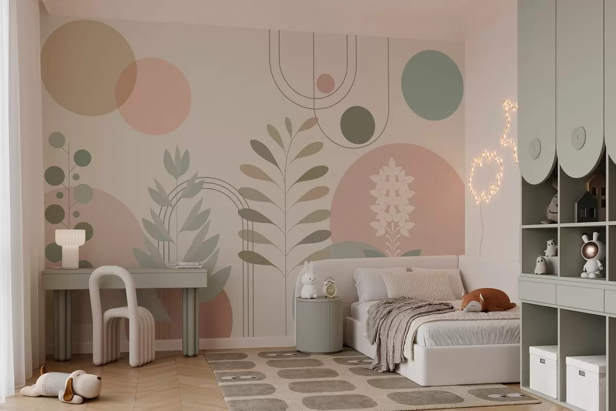 Fotobehang geometrische abstractie met cirkels en gestileerde planten op een crèmekleurige achtergrond N° w04070