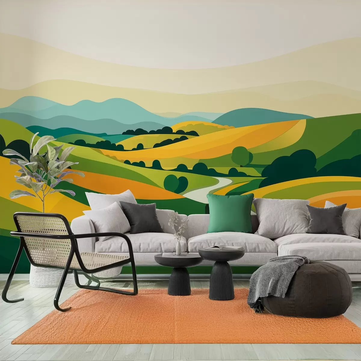 Fotobehang Abstract landschap met heuvels en bomen, levendige kleuren N° w04116