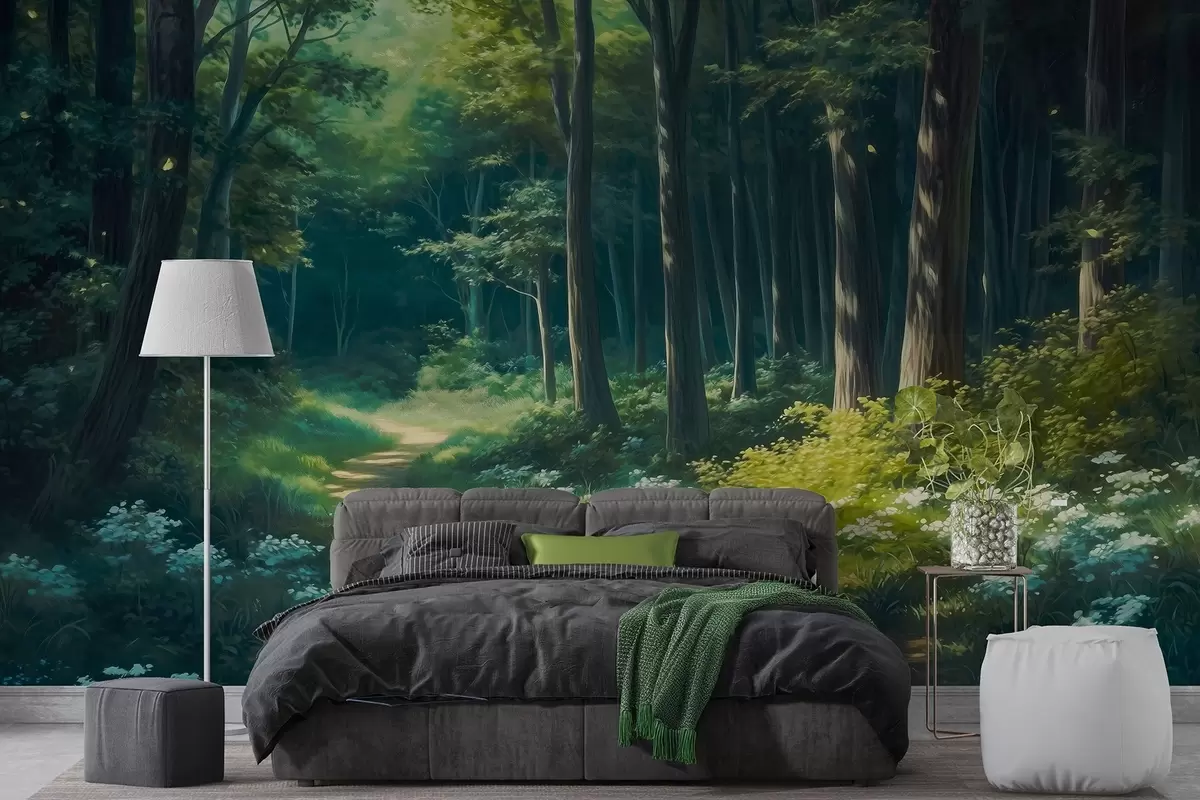 Fotobehang Groen bos met zacht zonlicht, bomen en witte bloemen, olieverf tekening N° w04118