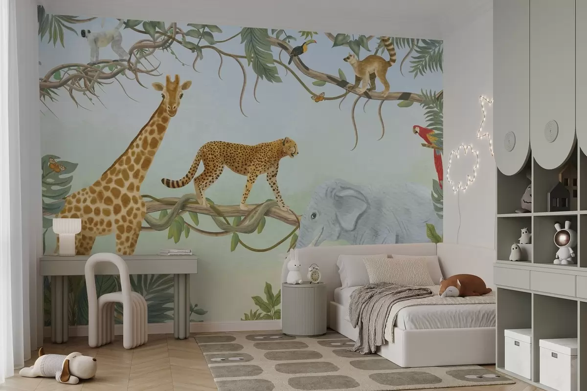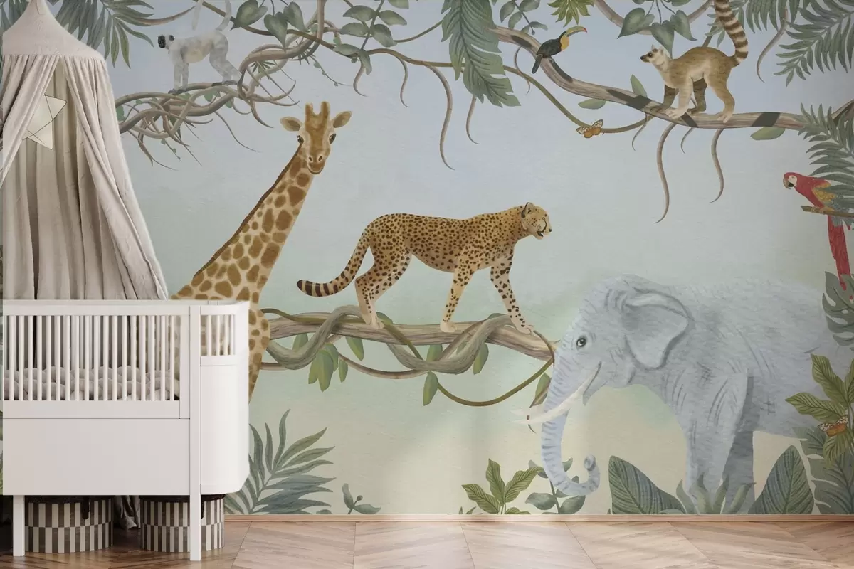 Fotobehang Jungle-illustratie met giraffe, cheeta en olifant N° w04194