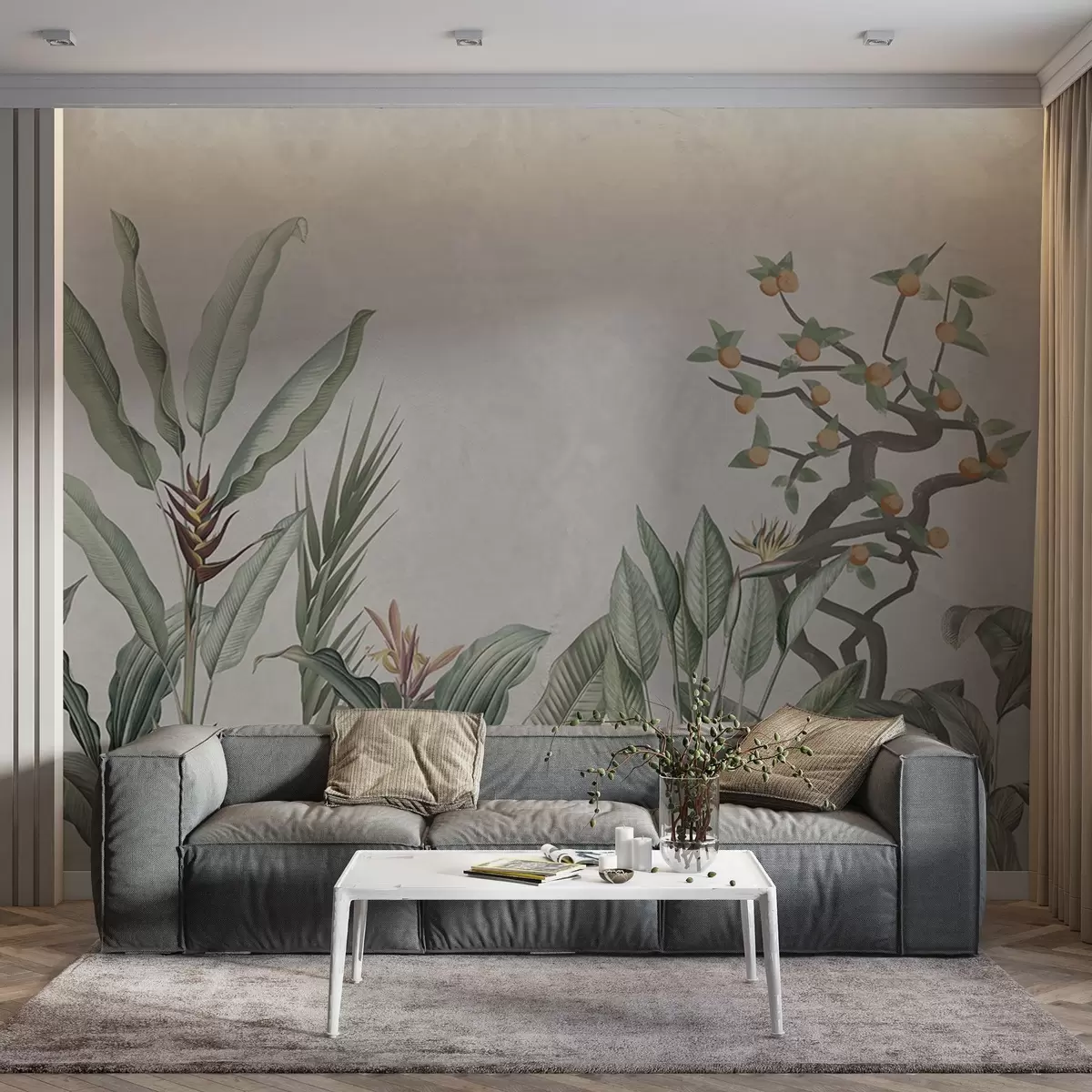 Fotobehang Tropische compositie met planten en boom op grijzige achtergrond N° w04201v1