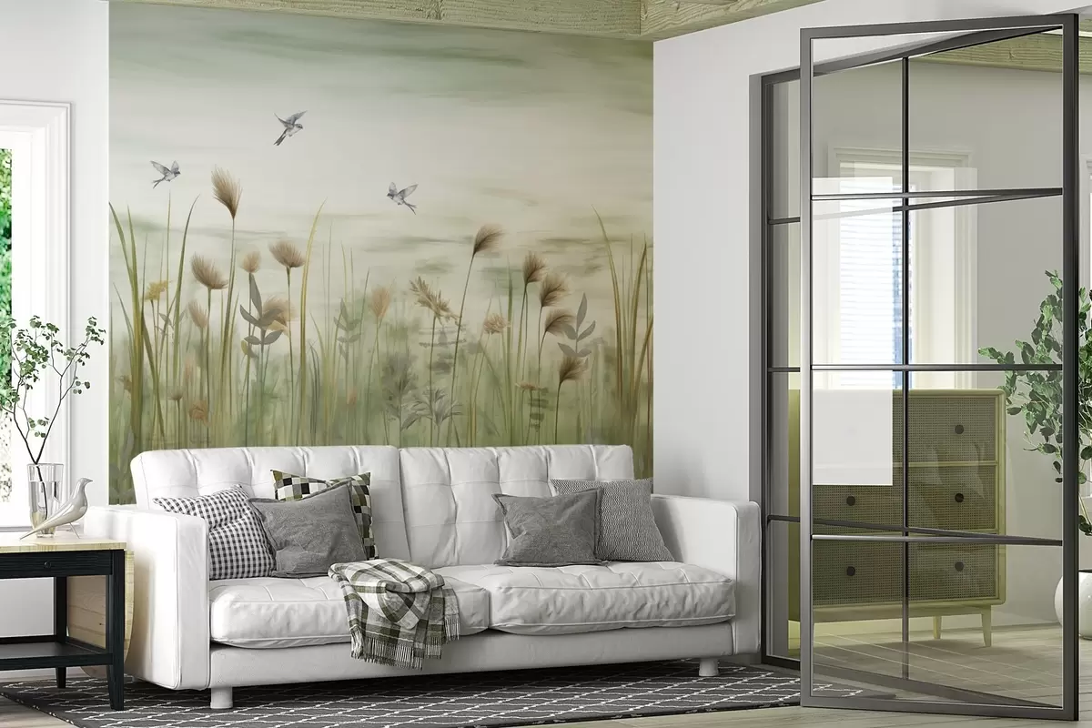 Fotobehang Graslandschap met zwaluwen tegen zachte lucht N° w04258v1