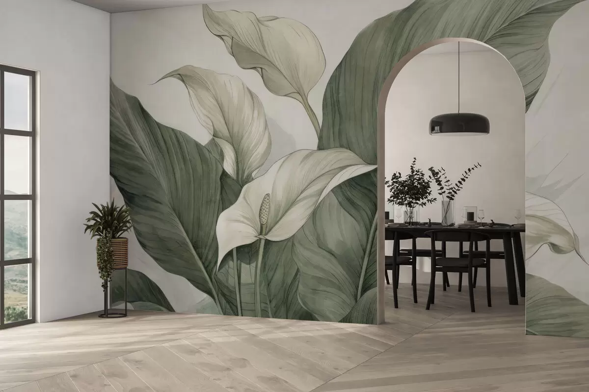 Fotobehang Close-up van bloeiende spathiphyllum met grote bladeren N° w04263