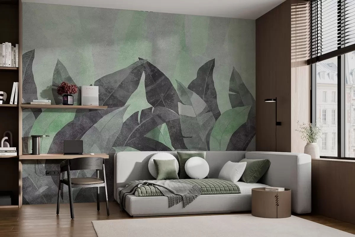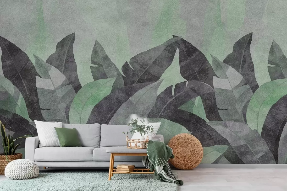 Fotobehang bananenbladeren met textuur in groene en grijze tinten N° w04285v1