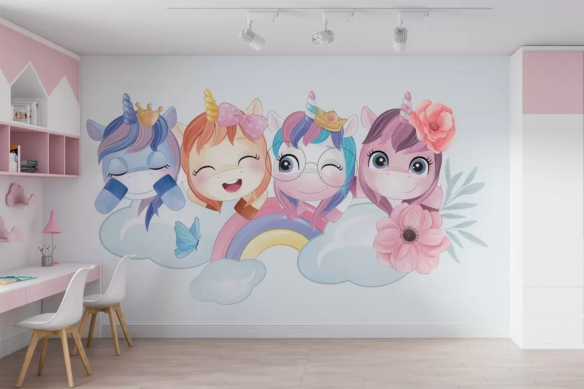 Fotobehang Schattige eenhoorns tussen wolken en regenbogen N° w04298