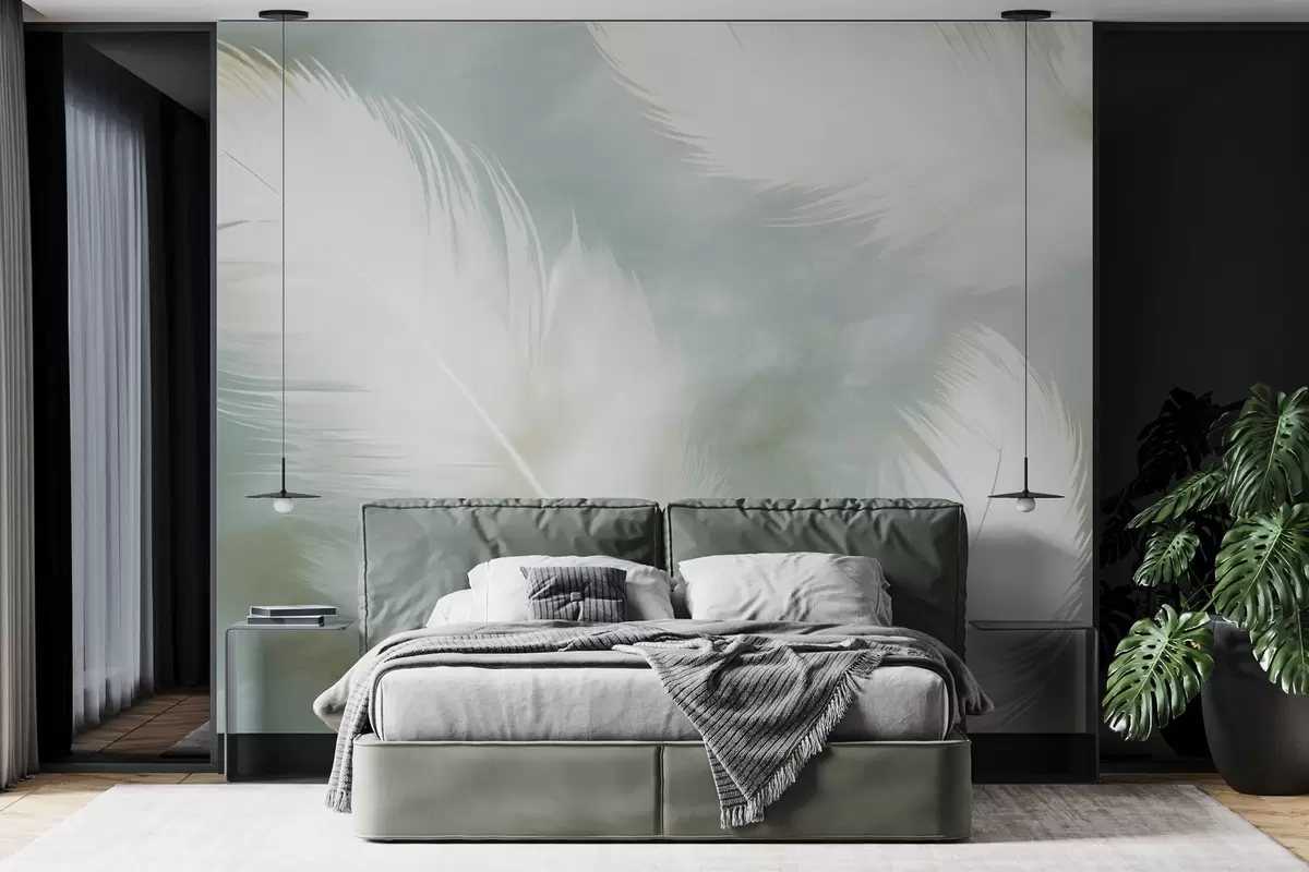 Fotobehang Delicate witte veren op een zachte mintkleurige achtergrond N° w04399