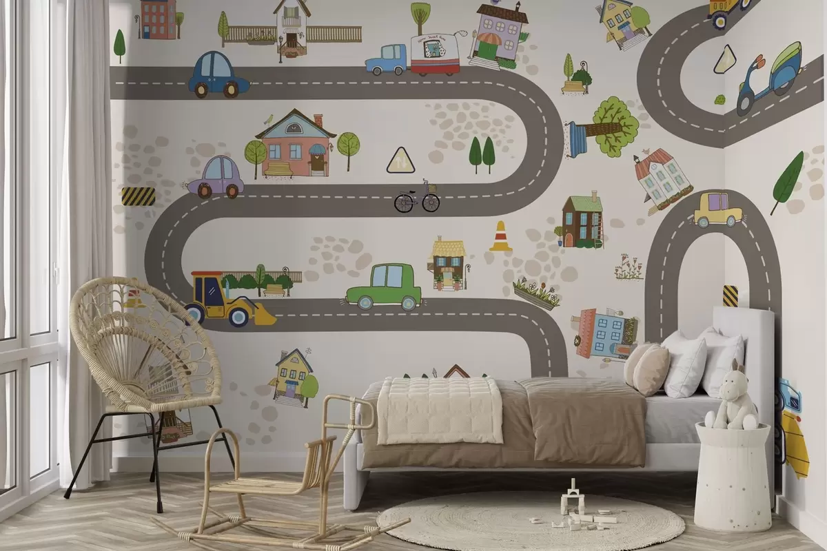 Fotobehang Kinderweg met auto's en kleurrijke huizen N° w04404