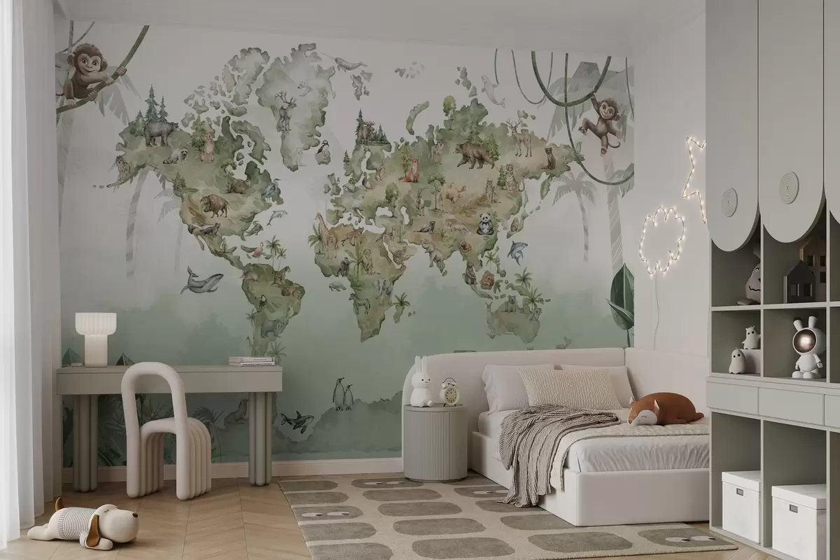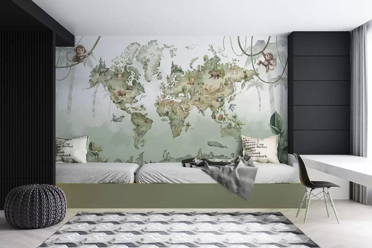 Fotobehang Wereldkaart in aquarelstijl met dieren N° w04418