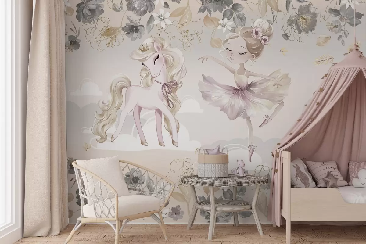 Fotobehang Sneeuwwitte pony en ballerina tussen bloemen en wolken N° w04419
