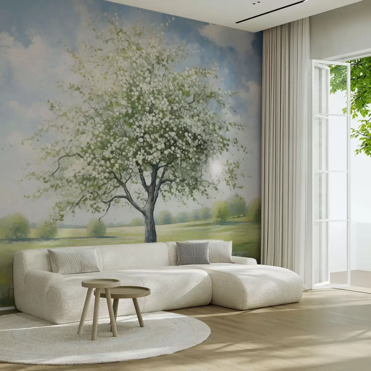 Fotobehang Een eenzame boom in een veld met witte bloemen N° w04445