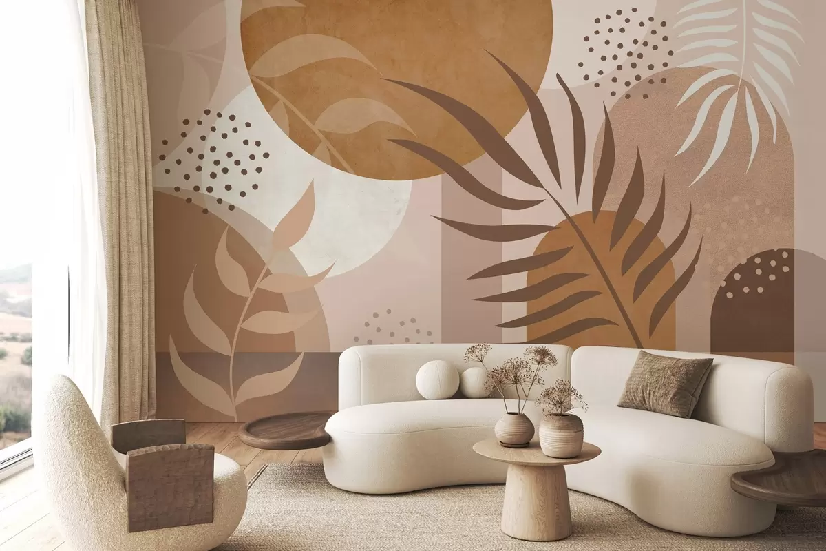 Fotobehang Eigentijdse abstractie met planten in bruin- en beigetinten N° w04497